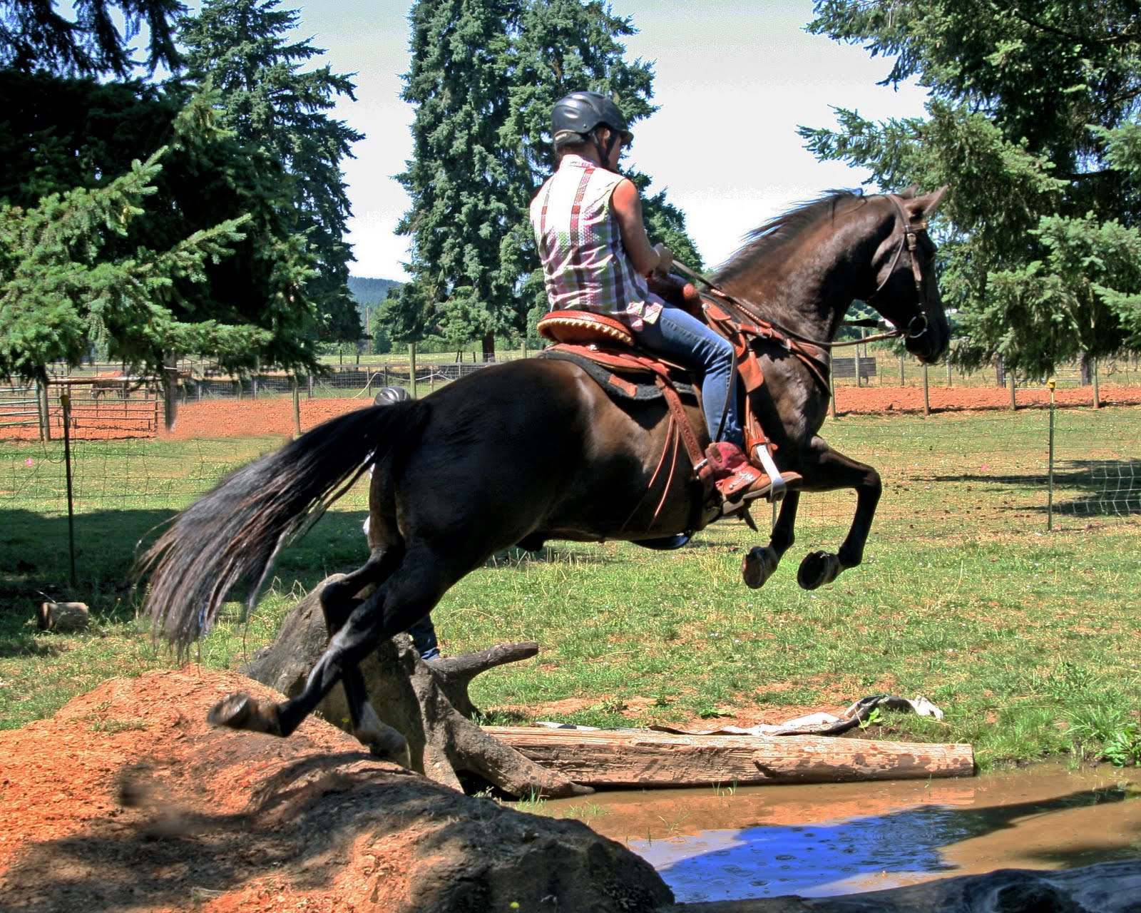 Here's one of my favorite pictures of the day. This is one of the more difficult obstacles in the course, stepping off a huge log into a little pond. Some horses delicately step down into the water, but others, well, they do this: